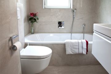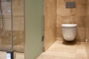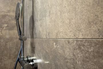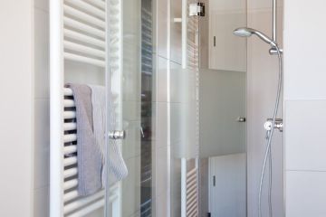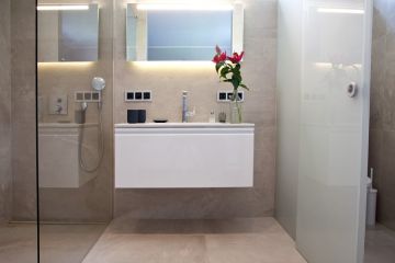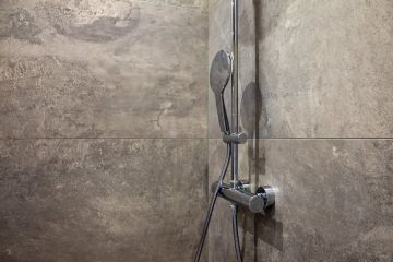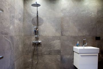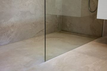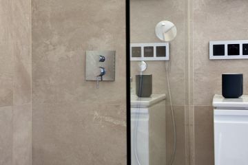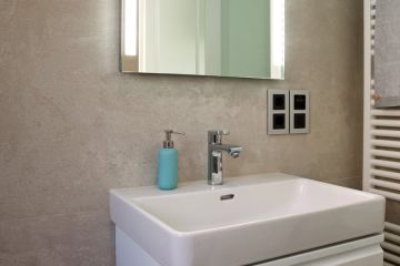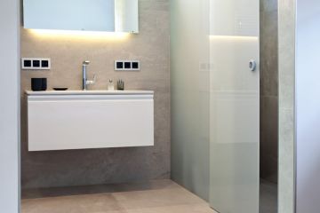 Effektiv auf kleinstem Raum: Mit nur 3,7 qm gehört dieses Badezimmer zu den kompakteren, umso wichtiger ist eine effiziente Lösung. In diesem Fall wurde durchgefliest. Das Feinsteinzeug, das sowohl für die Wände als auch den Boden verwendet wurde, hat die Maße 80 x 180 cm, die Farbe „metal-style soft 02“ sorgt für eine behagliche Umgebung.