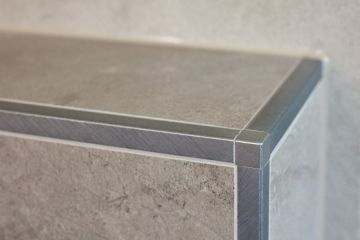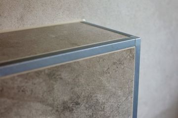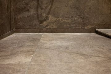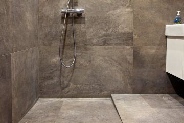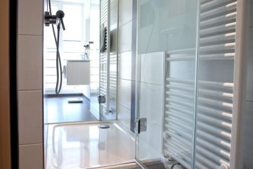 Auch ein kleineres Badezimmer verfügt über Potenzial, hier liegt ein Schwerpunkt auf den Details. Glatte Fliesen sorgen für großzügige Raum-Atmosphäre, die Einheit von Wand und Boden unterstreicht die Optik. Die begehbare, barrierefreie Dusche glänzt sowohl im Boden- als auch im Wandbereich mit einer Feinstein-Fliese im Format 60 x 120 cm, der Farbton ist „metal-style soft 03“.
