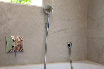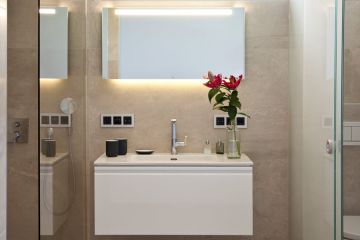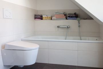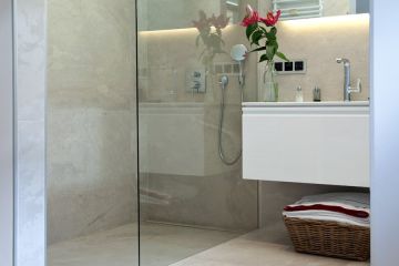 Die ausgewogene Mischung aus komfortabel und zweckoptimiert bestimmt dieses 6,8 Quadratmeter große Vollbad. Die Armaturen sind ergonomisch eingearbeitet, die passgenaue Wand- und Schiebetür bildet den Abschluss zum WC, das hochwertige Fliesenabschluss-Profil ist aus gebürstetem Aluminium-Quadek in Kombination mit einer 80 x 180 cm großen Fliese aus Feinsteinzeug.