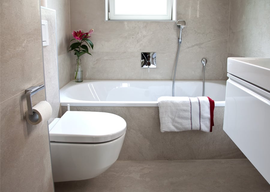 Effektiv auf kleinstem Raum: Mit nur 3,7 qm gehört dieses Badezimmer zu den kompakteren, umso wichtiger ist eine effiziente Lösung. In diesem Fall wurde durchgefliest. Das Feinsteinzeug, das sowohl für die Wände als auch den Boden verwendet wurde, hat die Maße 80 x 180 cm, die Farbe „metal-style soft 02“ sorgt für eine behagliche Umgebung.